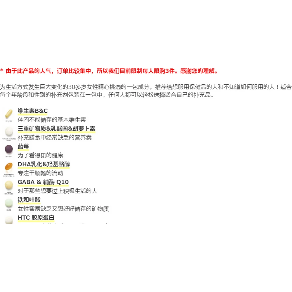 HTC胶原蛋白: 转为女性科学定制,在体内可以产生新的骨胶原,加强皮肤弹性,光泽度,抑制活性氧消失后由于紫外线引起的胶原蛋白分解,保持皮肤紧致和弹性。