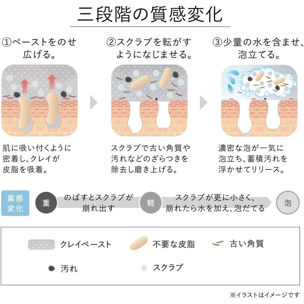 感受粘土洁面在脸上吸附皮脂的三个阶段变化,粘土吸附污垢,磨砂透出明亮肌肤,泡沫洗净。肌肤光滑滋润又明亮。